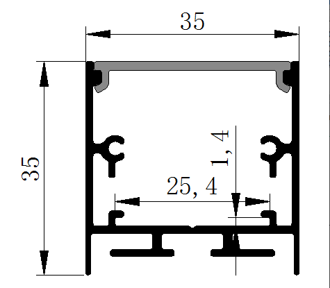 Алюмінієвий шириною 35мм для декоративного підсвічування для LED стрічки завширшки не більше 24мм. Розсіює світло на 120град. Можна використовувати як накладної або як підвісний. Йде в комплекті з екраном Opal, 2-мя заглушками і кріпильними ел-ми на 1м. Загальна довжина профілю 3м.